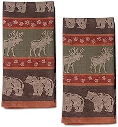 Soft and absorbent, these jacquard towels are made from colored yarns, the pattern is weaved into the towel. Perfect decor for a lodge or log cabin. With colors such as dark red, forest green, and medium brown, the towel has rows of moose and rows of bears across it. To separate these rows of images, there are rows of dark red, one row in between with moose, and another row in between with bear figures.