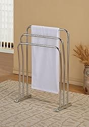 This towel quilt rack features three chrome bars to store your bathroom towels. Crafted of metal with chrome finish, this hanging rack will make an alluring addition to any home decor. Comes with a bottom shelf for extra storage. Measures 32.5 inches high x 23 inches wide x 11 inches deep. Simple assembly required